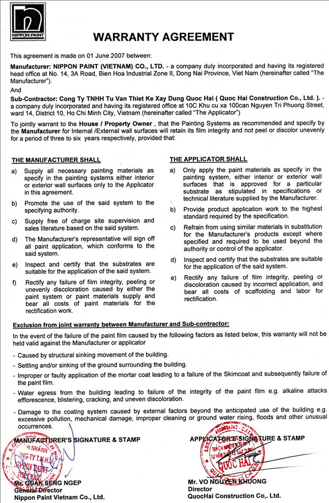 GIẤY CAM KẾT BẢO HÀNH SẢN PHẨM NIPPON PAINT VN.